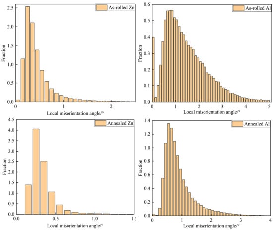 Figure 6 shows the interface geometrically necessary dislocations (GND) distribution maps and inverse pole figure (IPF) maps of as-rolled (Figure 6a,b) and annealing (at 280 °C for 2 h) (Figure 6c,d) samples. Here, the upper half of the figure shows the grain of Zn, while the lower part shows the grain of Al. From Figure 6, it can be seen that the Al grains are obviously finer than Zn grains for as-rolled (Figure 6b) and (Figure 6d) annealing sample, respectively. Due to the interaction of rolling pressure and interfacial friction, the Al undergoes severe plastic deformation through dislocation slip. Meanwhile, the grain boundaries become serrated and have a high distortion energy to be released. For Zn side, the grains are uniformly equiaxed and the GNDs density (Figure 6a,c) is significantly lower than that the Al side. It is obvious that Zn under the rolling state has undergone recovery and recrystallization, resulting in grain growth. In general, the non-uniformity of the microstructure is attributed to the friction effect between the roll and the plate surface in addition to the properties of the material itself []. In particular, the dislocations of Zn basically disappear after annealing, except for a small amount at the interface grain boundary in Figure 6a,c. This is due to the recrystallization temperature of Zn is relatively low. However, for Al side, grains are still elongated and broken, and begin to grow by recovery and recrystallization with the progress of annealing [,]. Figure 7 shows the local misorientation extracted from Figure 5, which can directly reflect the GND, the larger the misorientation is, the larger the dislocation density is, it is obvious that Al is much larger than Zn, and the density of each component decreases after annealing.