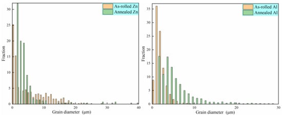 In addition, it can be seen that the texture orientation on Al before and after annealing is [001]||RD. Figure 8 shows the recrystallized grain distribution of the composite plate after rolling and annealing. Here, 500× and 1000× of grain distribution images are selected for as annealed and rolled, respectively. Since the grain size of Zn after annealing is very large and the number is relatively small, that of 500× is clear. In the figure, blue, yellow and red represents recrystallized grain, substructure, and deformed structure, respectively. In the rolling state, only a few grains of Zn are still in deformation, while Al contains a large number of deformed grains. The deformed structure and substructure of Zn side and Al side are recrystallized to produce a large number of recrystallized grains with the annealing process. The recrystallized grain fraction increases from 45%, 20.4% to 54% and 32%, respectively, in contrast, the growth rate of Al is higher than that of Zn. According to the Figure 6a,c, Al as-rolled has a higher dislocation density, and the higher the deformation energy storage, the more conducive to the dynamic recrystallization after annealing. However, for Al, although a large number of recrystallized grains have been formed, it also contains a large amount of deformation texture due to insufficient temperature and time in Figure 6b,d. Figure 9 shows the grain distribution size of Al side and Zn side under different annealing conditions.