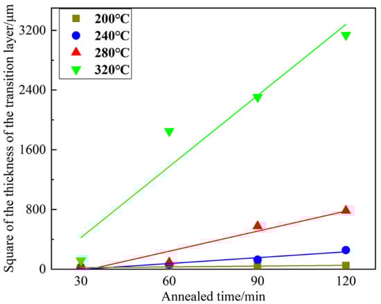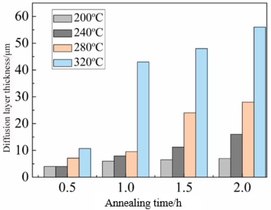 The thickness of the diffusion layer under different annealing condition is shown in Table 2 and Figure 10. In a short time and at a low temperature, there is a very low diffusion layer thickness and a slow growth rate, while with the increase of annealing temperature and time, the thickness of the diffusion layer increases gradually. The possible reason is that a large number of activated vacancies are generated at high temperature, which is conducive to the diffusion of interfacial atoms [,].