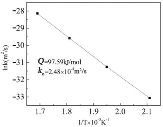 where k0, Q, R, and T represent the growth constant, diffusion activation energy, mole gas constant and annealing temperature, respectively. Figure 12 shows the relationship between interfacial diffusion layer of Al/Zn laminates and annealing temperature. As shown in Figure 12, the logarithm of the growth rate of the composite plate has a linear relationship with the reciprocal of the absolute temperature. There was a linear fitting of the curve with a slope of −Q/R and a longitudinal intercept from the coordinate axis of lnk0, The diffusion activation energy Q of the diffusion layer is 97.59 kJ/mol and the growth constant k0 is 2.48 × 10−4 m2/s.