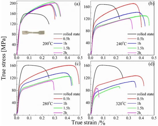 Figure 13 shows the true strain-stress curve of Al/Zn laminated composite plate under different annealing conditions. The strength and uniform elongation are listed in Table 4. With the increase of annealing temperature and time, the tensile strength increases first and then decrease. Compared with the rolled state, at 200 °C, the yield strength does not change much, but the tensile strength is greatly improved, which is mainly related to the diffusion layer. This is due to that diffusion can help to optimize the interface structure and improve performance [,]. The diffusion layer with a certain thickness plays a higher metallurgical bonding role and coordinates the difference in stress of component metals, moreover, according to the Hall-Petch strengthening [], the grain size at low temperature is relatively small, so the strength is improved. When the annealing temperature is 240 °C or above, the strength decreases continuously with the extension of time. Combined with the previous metallographic morphologies and EBSD microscopic analysis, it is because of the grain growth and the decrease of dislocation density. Although the diffusion layer produced by these temperatures is thick, it is not enough to counteract the effect of grain growth. The uniform elongation increases first and then decrease. The increase is mainly due to the effect of recovery and recrystallization, moreover, the diffusion layer also provides a certain work hardening ability. And the decrease is due to the increase of time and the grain size to a certain extent. When the annealing condition goes up 320 °C × 2 h, the uniform elongation is 4.73%, reaching the brittle fracture level.