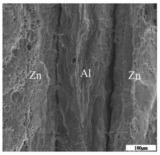 As can be seen from Table 4, the Al/Zn composite plate has a better strength and toughness fit at 200 °C for 0.5 h. Therefore, tensile fracture morphology under these condition can be observed, as shown in Figure 14. It can be intuitively seen that the fracture cross-section of the Al/Zn layered composite plate is an obvious sandwich structure, with Zn at both ends wrapping around the middle layer of Al. The cross-section fracture of Al is very narrow, and only a line in the middle can be seen, indicating that the plastic toughness of Al is very good at this time.