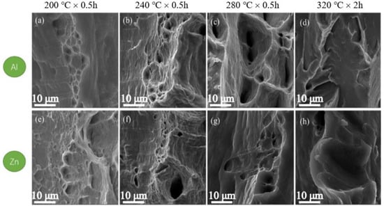 Figure 15 shows the tensile fracture morphology of the composite laminates under different annealing conditions. When the annealing condition is 200 °C × 0.5 h, the fracture after necking occurs obviously in aluminum, but the necking is not obvious in Zn, although there are many small dimples and tear edges. With an increase in temperature, necking phenomenon also appeared on the fracture surface of Al, and the tearing edge was more obvious. Furthermore, more dimples appeared on the fracture surface of Zn compared to low temperature. This can explain the better shaping of 240 °C × 0.5 h. As shown in Figure 15d,h, at higher temperatures and longer annealing times, the dimples are not seen in the morphology, and the surfaces are separated. This is why elongation at 320 °C × 2 h is the lowest and even brittle fracture occurs.