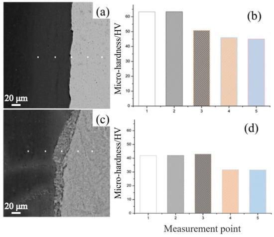 Micro-hardness of the interface test points in the rolled state (a,b) and that of the interface test points at 280 °C × 2 h (c,d).