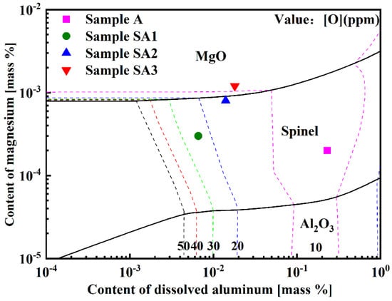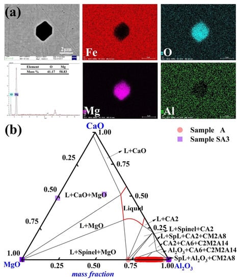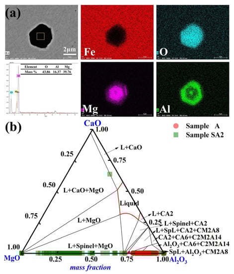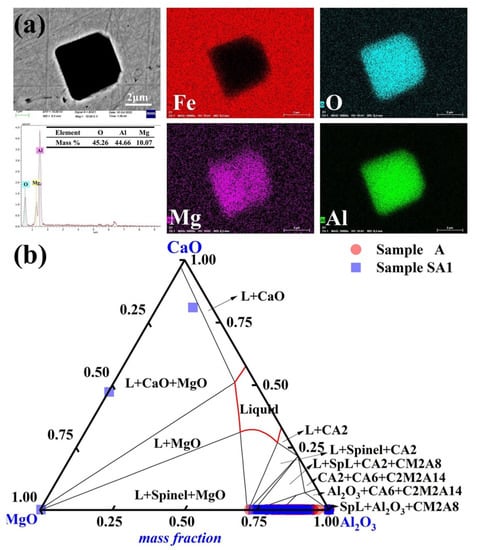 - Jiang, M.; Wang, X.; Chen, B.; Wang, W. Formation of MgO-Al2O3 inclusions in high strength alloyed structural steel refined by CaO-SiO2-Al2O3-MgO Slag. ISIJ Int. 2008, 48, 885–890. [Google Scholar] [CrossRef]