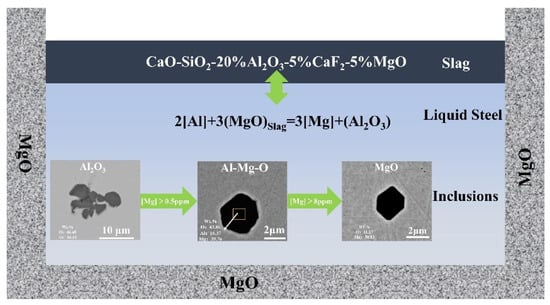 - Liu, C.; Gao, X.; Ueda, S.; Kitamura, S. Change in composition of inclusions through the reaction between Al-killed Steel and the slag of CaO and MgO saturation. ISIJ Int. 2019, 59, 268–276. [Google Scholar] [CrossRef]
