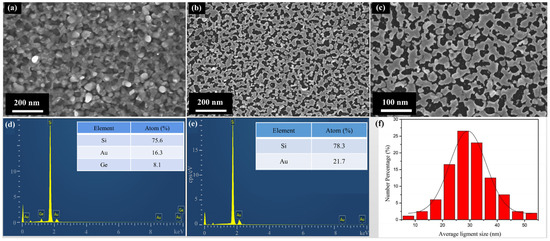Figure 3 shows the SEM image and the corresponding EDS mappings of the NPG thin film after etching. The result indicates a nanoporous structure in the etching film, which consisted of Au ligaments. The Si element was abundantly distributed in the whole scanned area, which was because the prepared porous gold film layer was very thin and the SEM mapping results could detect the Si element from the silicon substrate. The distribution of Ge elements was sparse and scattered. Combined with the results of the quantitative elemental analysis in Figure 2d, it can be indicated that Ge elements were completely removed after the etching of the NPG precursor film.