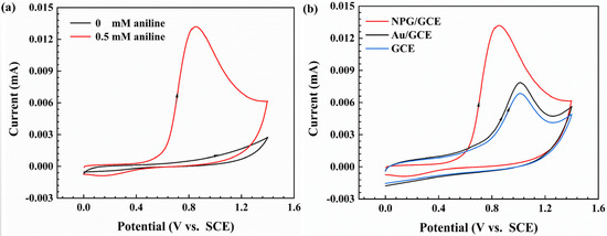 The CV curve recorded in a buffer with (0.5 mM) and without aniline was obtained under the potential of −0.2 V to 1.6 V, and the scan rate of 100 mV s−1 (see Figure 6a, the arrow represents the direction of potential scanning). It follows that there was no redox peak in the NPG electrode without the added aniline buffer solution, whereas, an obvious oxidation peak appeared at about 0.9 V after the addition of 0.5 mM of aniline. The results above indicated that the NPG electrode can effectively detect aniline. In addition, the oxidation of aniline involving multiple complex reactions that produce polymer attachment to the electrode surface resulted in the absence of a reduction peak. Furthermore, aniline undergoes oxidation to produce a free radical, which readily dimerizes to form benzidine or p-amino diphenylamine. As a result, the polymer on the electrode surface can be removed by increasing the potential [36]. Figure 6b shows the cyclic voltammetric characteristic curves of NPG/GCE, Au/GCE, and GCE electrodes in BR buffer solution with 0.5 mM of aniline added. The results show that the peak currents of the NPG/GCE and Au/GCE electrodes for the detection of aniline were higher than those measured with the pure GCE electrode, which indicates that gold can improve the electrochemical performance of the GCE electrode for the detection of aniline. The peak currents measured with the NPG/GCE electrode were much higher than those with the Au/GCE electrode, indicating that NPG exhibited a higher catalytic performance for the electrochemical detection of aniline compared to pure gold materials. The superior catalytic performance of NPG is related to its higher electrocatalytic active surface area and more catalytic active site.