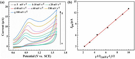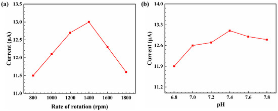 Figure 7a shows the relationship between the peak current and the electrode rotation speed. The peak current (measured at 0.9 V) was measured in the solution with 0.5 mM of buffer at 100 mV·s−1. The peak current increased and reached the maximum peak current when the rotation speed reached 1400 rpm, and then it decreased as the electrode rotation speed increased. As the rotation speed increased, the distance of the diffusion layer of the solute decreased, the diffusion rate of the reactant increased, and the peak current increased. With the further increase of the electrode rotation speed, the peak current decreased instead. Although the diffusion rate of the reactant continued to increase, the too-fast rotation speed of the electrode led to the convection of the solution, and generated high shear stress [37]. The process of polymerization of aniline oxidation products on the surface, thus leading to a decrease in the peak current, was accelerated. In order to obtain the optimum experimental conditions under neutral solution conditions, the relationship between the peak current and pH was investigated within the neutral pH range. Figure 7b shows that the peak current reached a maximum at the pH of 7.2. Therefore, all subsequent experiments were performed at speeds of 1400 rpm and a pH of 7.4.
