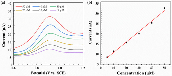 The partial CV curves obtained in a buffer solution with different concentrations of aniline are shown in Figure 9a. The ampere current response was measured at different concentrations of aniline at 0.9 V. Before the test, five cycles were performed to ensure the stable response current and the reliability of results. There was a linear relationship between aniline concentration and current (Figure 9b). The sensitivity was measured as 450 nA μM−1. The limit of detection (LOD) was found to be 0.5 µM with a signal-to-noise ratio of 3 (S/N = 3). The comparison of the performance of non-enzymatic electrochemical sensors constructed with the NPG/GCE electrode and other electrode materials regarding aniline detection is summarized in Table 1 [3,4,36]. The NPG/GCE electrode developed in this work showed a higher sensitivity for aniline compared to previously reported electrodes. This excellent electrocatalytic performance of NPG/GCE is associated with the large active surface area and the large number of surface defects generated using an improved solid-phase reaction method (see Figure 3).