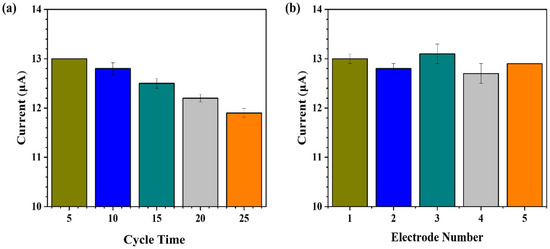 Peak current of (a) the prepared NPG/GCE electrode under voltammetry tests with different times of cycles (5, 10, 15, 20, 25), and (b) every NPG/GCE electrode (numbered 1–5) after 5 cycles of voltammetry testing.