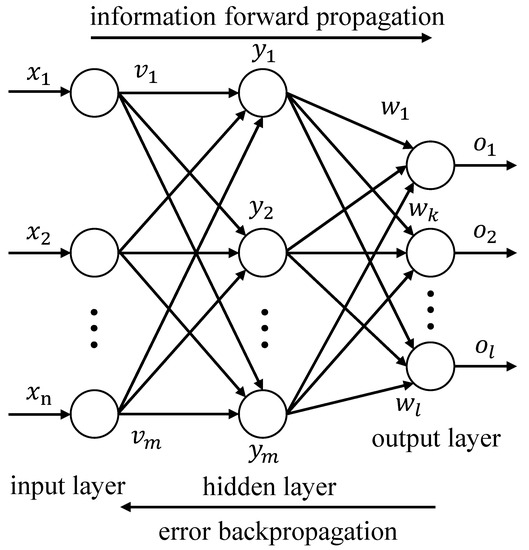 A typical BP neural network consists of three parts: the input layer, the hidden layer, and the output layer. There are nodes in each layer, and weights connect the nodes in adjacent layers. Theoretically, with one hidden layer, the BP neural network can approach any nonlinear function according to the predetermined accuracy requirements [32]. The core idea of the BP neural network algorithm is that the training process is mainly divided into two parts: signal forward propagation and error backpropagation. When the input layer receives the signal, it will pass it to the hidden layer. The hidden layer processes the signal according to the connection weight threshold and activation function and then passes it to the output layer. After the output layer receives the signal, it will compare the result with the actual value. The actual value is compared, and the error is obtained according to the connection weights and thresholds between the layers. Then the error is back-propagated [33], as shown in Figure 1.
