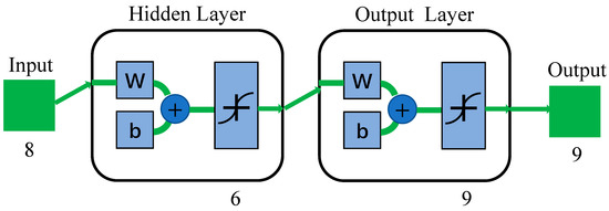 In this paper, the tangent Sigmoid function is used as the activation function in the training of neural networks. The function is continuously differentiable for the input of the range [–1, 1], and the derivative value changes significantly, which can meet the requirements of gradient sensitivity in the process of error backpropagation. Therefore, it is necessary to normalize the sample data before training, and map it to between −1 and 1, to avoid the saturation of neurons in each layer during the training process and, simultaneously, make the model converge more quickly. This paper uses MATLAB software’s mapminmax function to perform the normalization operation. The BP neural network model used subsequently is shown in Figure 2, which is the most typical three-layer structure, including one layer of an input layer, a hidden layer, and an output layer.