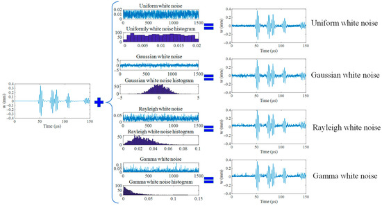 The BP neural network’s training process requires using time-domain signals constructed in the form of vectors or matrices. In this paper, the parameter of the time of arrival of the first wave packet in the time domain signal is selected, and the eight times of arrival obtained from all receivers are collected to construct the input. In the numerical simulation, according to the set integration time step and total duration, the length of each received signal is 1500 samples. It should be pointed out that the low amount of data and lack of variability obtained in a numerical simulation environment is not sufficient to train a neural network. Therefore, it is necessary to enhance the data of the samples to improve the quantity and quality of the samples, thereby improving the model’s generalization ability. Data enhancement is achieved by adding white noise to the initial time-domain signal, and the robustness of the model may also be promoted. As shown in Figure 3, four different white noises are added to the time domain signal: white Gaussian noise, white Uniform noise, white Rayleigh noise, and white Gamma noise. In a wide frequency range, the noise power spectral densities in each band of equal bandwidth are equal, and the amplitudes obey different probability distribution functions. As an example, consider white Gaussian noise to compare the influence of noise with different signal-to-noise ratios on the waveform. As shown in Figure 4, when the signal-to-noise ratio of white Gaussian noise is greater than 35 dB, it has little effect on the time of arrival of the first wave packet, which cannot achieve our purpose of expanding the dataset. While the signal-noise ratio is lowered to 30 dB, the times of arrival start to differ within a specific range. When it is reduced to 25 dB, the white noise severely impacts the initial signal. Moreover, it is hard to distinguish each wave packet. When it is further reduced, to less than 20 dB, it is no longer possible to distinguish between noise and signal. Based on the above comparison, it is proposed to add four kinds of 35 dB white noise to the initial time domain signal for data enhancement.