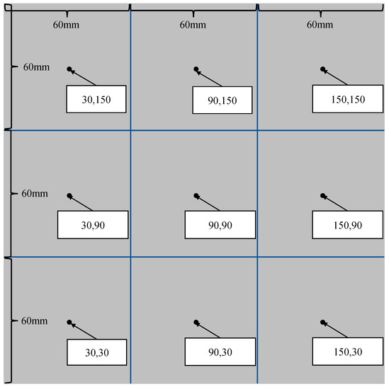 COMSOL numerical software has a powerful multi-physics coupling analysis module, which is suitable for simulating the propagation of ultrasonic-guided waves in plates. A three-dimensional finite element model of the isotropic aluminum plate was established in the solid mechanic’s module. Aluminum has a density of 2700 kg/m3, a Poisson’s ratio of 0.33, and Young’s modulus of 70 GPa. As shown in Figure 5, the size of the aluminum plate model is 180 × 180 × 1 mm, divided into nine areas equally. Each area is a square of 60 mm × 60 mm. The training data actuate point is set at every region’s center, which is (30, 150), (90, 150), (150, 150), (30, 90), (90, 90), (150, 90), (30, 30), (90, 30), (150, 30), corresponding to the coordinates of the central point of region one to region nine in Figure 5.