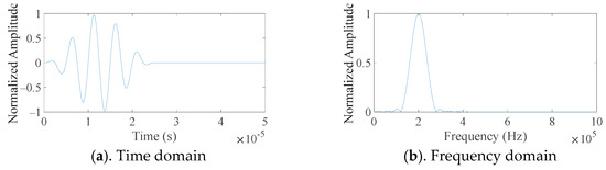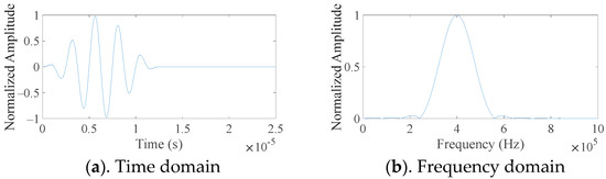 Because of the multi-mode and dispersion characteristics of Lamb waves in the propagation process, the signal captured by the sensor is very complex. In this paper, to compare and test the robustness of the neural network, five-peak signals with two central frequencies of 200 kHz and 400 kHz are selected, respectively. They are applied to the plate as point loads. Taking 400 kHz as an example, Figure 6 shows the input signal in this model.