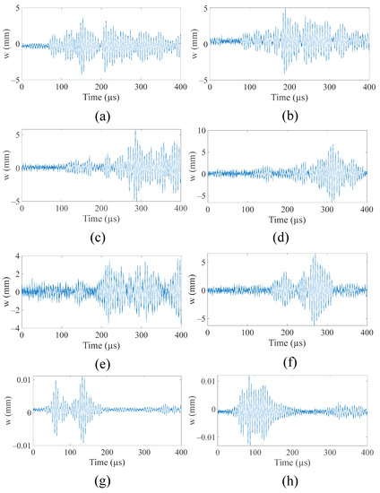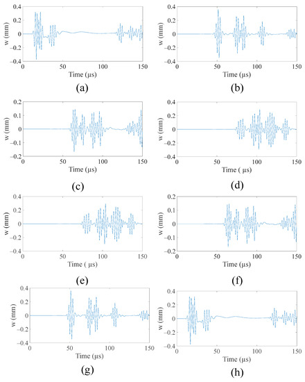 After setting up according to the above three sections, the Lamb wave propagation process is obtained when the central point of area 3 is excited once as shown in Figure 8. The rest of the regions are excited in the same way. Figure 9 shows the time domain signals captured at the eight receivers at the boundary at this time. It can be observed that there is a significant difference in the time of arrival of the first wave packet due to the different positions of the receiving point from the excitation point. This is precisely the feature that the neural network needs to study in order to map this feature value to its source.