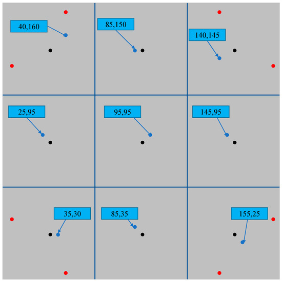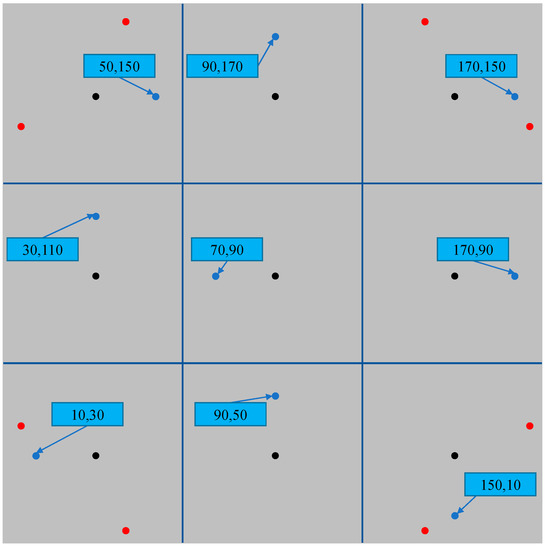 After preprocessing the training data set outlined in Section 2.2, arrange multiple sets of different test sets to test whether the trained BP neural network could determine the area to which the new five-peak narrow-band sinusoidal modulation signal excitation source belongs. First, take points near the center point of the area. As shown in Figure 10, the excitation point is set 10 mm from the center of each area, and the same signal with a central frequency of 400 kHz is applied to it for excitation. After the eight receiving points capture the time domain signal, also according to the methodology in Section 2.2, four different white noises are randomly mixed, so that five test samples can be acquired for every excitation. Altogether 45 samples in nine areas are used to test the training effect of the neural network.