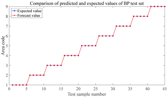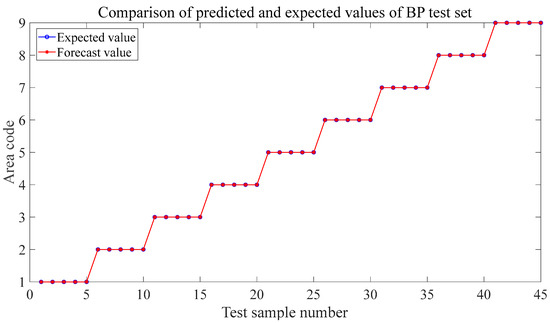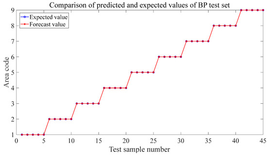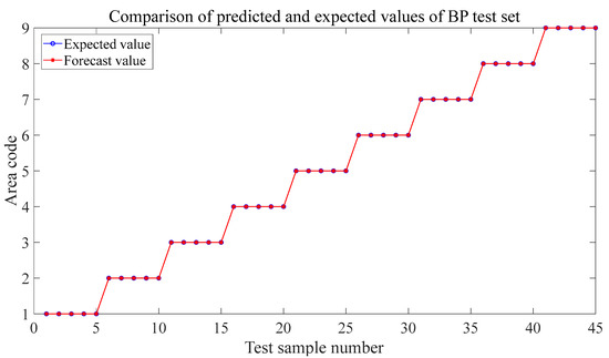 Having preprocessed the test data, the next step is to input the BP neural network described in Section 2.1 to make predictions. Figure 11 shows the prediction results. All 45 samples were judged correctly, and the trained model accurately predicted the region to which each wave source excitation point belonged at that moment, with a precision rate of 100%. This shows that the BP neural network model constructed in this paper can learn the regularity of the input feature values and map the excitation points to a certain extent near the central point of the training set to their sources.