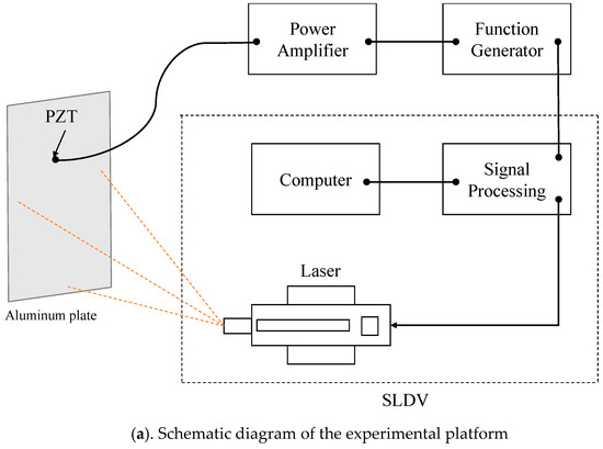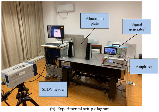 Figure 17 shows the specific arrangement of the experimental platform. First, the preset five-peak narrow-band sinusoidal modulation signal excitation signal is output through the AFG 31000 series signal generator produced by Tektronix, amplified by the Aigtek’s ATA-2021H power amplifier, and then output by the piezoelectric sheet. Secondly, the PSV-500-M Laser Doppler Vibrometer (SLDV) laser head produced by Polytec is used to collect the vibration signal of the corresponding scanning point on the aluminum plate, and the collected time domain signal is sent back to the signal processor. The received signal can be seen through the display. The aim of this study is to detect the position of the sound source in the metal plate, acoustic signals are generated by vibrations, and if there is sound, there must be vibrations. A sound source in the panel generates a transient elastic wave. We want to detect the source of the sound by detecting the vibration.