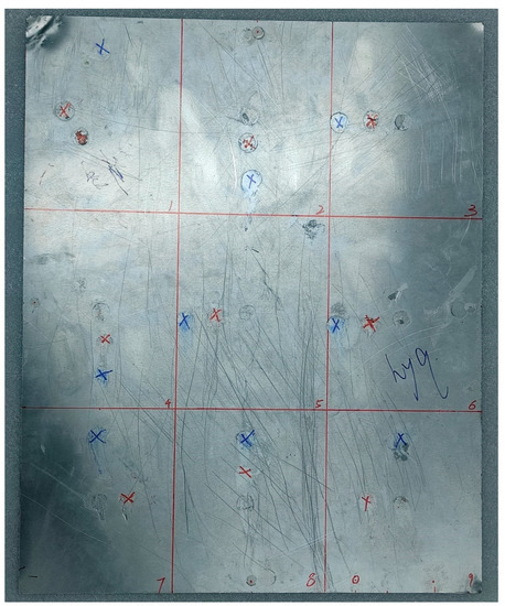 Figure 19 shows the area division on the back of the aluminum plate, which is divided into nine rectangular regions of 133.3 × 166.7 mm2. Similar to Section 4, two sets of test sets with different locations are also set to check out the model’s forecasting ability. The piezoelectric sheet excites the center point of each area of the aluminum plate with a five-peak narrow-band sinusoidal modulation signal with a central frequency of 200 kHz to obtain the training set data. Both red and blue markers appear in Figure 19, representing two test sets. The distance from the red mark to the center of the region is 30 mm, corresponding to the test set near the center of the region in Section 4.1; the distance from the blue mark to the center of the region is 60 mm, corresponding to the test set near the boundary of the adjacent region in Section 4.2. Set the same 200 kHz five-peak narrow-band sinusoidal modulation signal as when collecting the training set data for periodic excitation.