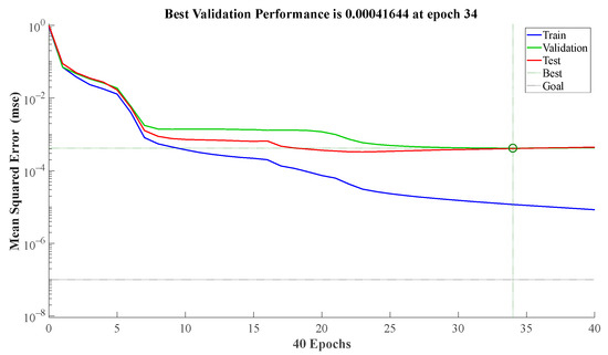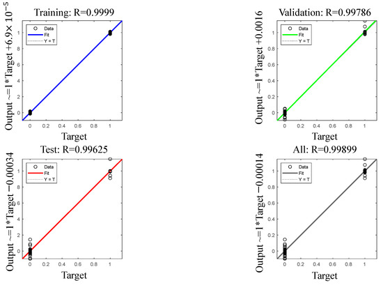 After the same preprocessing, the BP neural network built in Section 2.1 predicts the region where the five-peak narrow-band sinusoidal modulation signal input source is located. After training, the fitting results of the model are shown in Figure 21. It can be seen from the iteration diagram that after the training, the fitting accuracies of training, validation, and testing are: 0.99994, 0.99789, and 0.99812, which are over 0.99 in all cases, which indicates that each dataset fits exceptionally well.