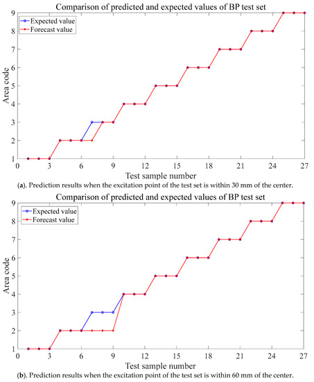 Figure 13 shows the prediction results at this time. Although the point of the prediction set is already 20 mm away from the center of the region, which is closer to the border of the adjacent region than the point of the training set, the prediction precision of the model trained with the data set of the center of the region can still reach 100%. It can be seen that the numerical simulation environment can obtain very accurate prediction results, whether near the center or the boundary. This powerfully proves the feasibility of the methodology used in this study. The trained BP neural network could quickly and precisely determine the region where the five-peak narrow-band sinusoidal modulation signal actuating source is located in the aluminum plate.