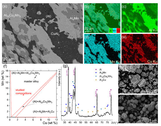 (a) SEM microstructure after solidification and further annealing at 520 °C for 24 h, (b–e) element distribution SEM-EDS maps, (f) isothermal cross section at 400 °C for the Al-Mn-Cu diagram, (g) XRD spectrum, (h) granules of the Al—14.3 wt% Mn—6.5 wt% Cu master alloy after mechanical milling for 20 h, and (i) SEM micrograph for Al powder.