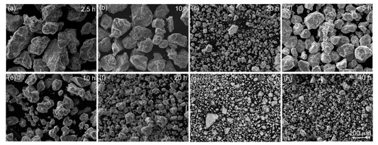 Morphology of the granules of (a–c) the mixture of the master alloy chips with Al powder (sample A) and (d–h) the mixture of the pre-milled master alloyed granules with Al powder (sample B), after high-energy ball milling for 2.5–40 h (micrographs presented at the same magnification).