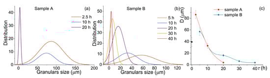 Evolution of (a,b) the distribution of the granular size and (c) a mean size value during the high-energy ball milling of (a) sample A and (b) the pre-milled sample B.