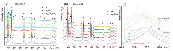 Evolution of (a,b) the XRD pattern and (c) the Al solid solution peak of (a) sample A and (b) the pre-milled sample B during high-energy ball milling for 2.5–20 h.