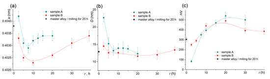 Evolution of (a) the lattice parameter, (b) the coherent scattering region D, and (c) the microhardness during the high-energy ball milling of sample A and sample B.