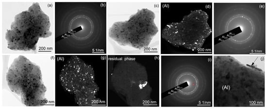 TEM structure of (a,b) sample A after milling for 20 h and (c–j) the pre-milled sample B after milling for (c–e) 20 h and (f–j) 40 h; (a,c,f,j) bright field images, (d,g,h) dark field images, and (b,e,i) the corresponding SAEDs; the red-colored ring in SAED (i) is the reflection for the dark field image presented in (h).