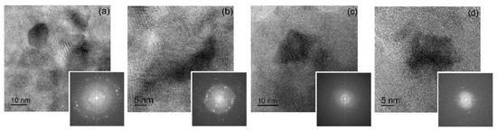 High-resolution TEM images with corresponding FFT images for (a,b) sample A and (c,d) sample B.