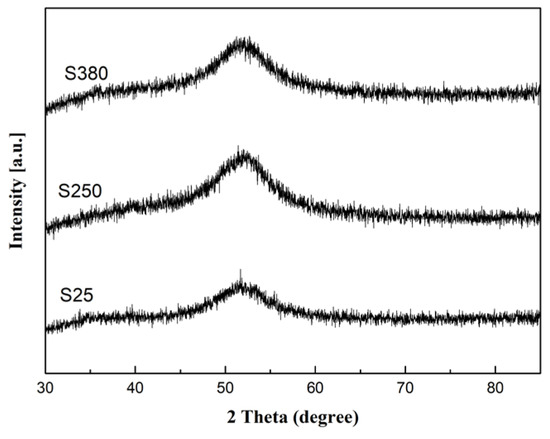 As shown in Figure 2, the XRD patterns of as-cast and annealed FeSiB alloy samples S25, S250, and S380 exhibit broad peaks without any sharp diffraction peak related to the crystalline phase. This suggests that all the samples keep an amorphous structure.