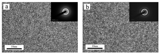 In order to further confirm that the as-cast and annealed FeSiB amorphous alloy ribbons are amorphous, they were tested by HRTEM. Figure 3 shows the HRTEM images and corresponding selected area electron diffraction (SAED) patterns of S25 and S380. For the as-cast (Figure 3a) and annealed sample (Figure 3b), no precipitated nanometer-sized phase is detected, only the homogeneous mazy contrast and a diffuse halo are presented, This is a typical structural characteristic of amorphous alloys, which is consistent with XRD results, demonstrating that these three samples annealed at different temperatures still remain a monolithic amorphous structure.