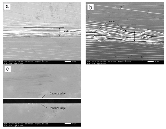 The macro and micro images of the bent crease and resultant fracture surface of these three samples were investigated by scanning electron microscopy (Field Emission Scanning Electron Microscope, FESEM, JSM-7500F, JEOL, Japan) and transmission electron microscope (TEM, JEM-2100, JEOL, Japan). The FeSiB amorphous alloy ribbons were subjected to nano-indentation testing (Agilent G200, Keysight, Santa Rosa, CA, USA) using a Berkovich diamond indenter with an effective tip radius of 25 nm. The experimental samples were mechanically polished to ensure that the surface of the FeSiB amorphous alloy ribbons was perpendicular to the loading direction of the indenter and tested in a constant temperature and humidity as well as a quiet environment. The load was increased at rates of 0.01, 0.05, 0.1, and 0.2 mN/s. The nano-indentation test was conducted 10 times at various loading rates for each sample.