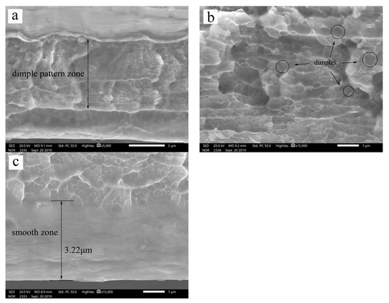 Fracture surfaces for S25: micro-scaled dimple pattern zone (a); enlarged images for dimple (b); smooth zone (c).