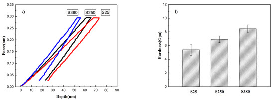 Force-depth curves (a) and hardness (b) of S25, S250, and S380 by nanoindentation with a loading rate of 0.2 mN/s.