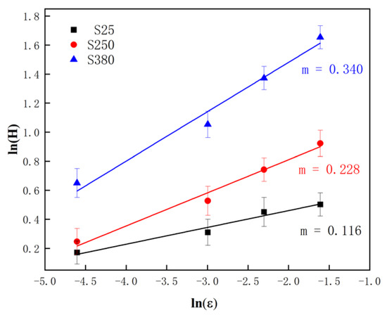 Determination of the strain rate of hardness(m) for S25, S250, and S380.
