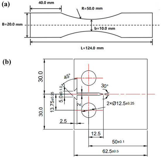 According to the GB/T 26076-2010 standard, the smooth high cycle fatigue (HCF) test was carried out on a QBG-50 fatigue testing machine, and 30 samples were randomly selected from different positions of the plate for experimental fatigue testing. Considering the service conditions of beam steel and experimental conditions, the axial tension test is adopted with a stress ratio R = 0.1. Loading force form is sinusoidal waveform for all fatigue test. The experiment ends when the sample breaks or the number of cycles reaches 107. In order to improve the fatigue data confidence, the fatigue limit σ0.1 is measured by the step method. The HCF experiment takes 3 to 5 stress levels, and the stress increment of each level is about 3% of the fatigue limit σ0.1. To minimize the effect of surface roughness, the surfaces of all specimens were polished in the axial direction with 600 to 1500 grit paper. After the fatigue specimen fractured, a Zeiss Evo18 SEM was used to observe the fatigue fracture, and the composition of inclusions at the fracture was analyzed by EDS analyzer. The fatigue crack growth (FCG) rate test was performed using a standard compact tension (CT) specimen (W = 40 mm) according to GB/T 6398-2017. The geometry and dimensions of HCF test specimen and FCG growth test specimen used in the present study is shown in Figure 2. The thickness of the specimens for fatigue test and fatigue crack growth rate test are both 4 mm.