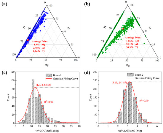 Composition distribution characteristics of the inclusions in Beam-1 steels (a) and Beam-2 steel (b); statistical histogram of Al/Mg mass ratio of (Al, Mg) Ti inclusions in Beam-1 steel (c) and Beam-2 steel (d).