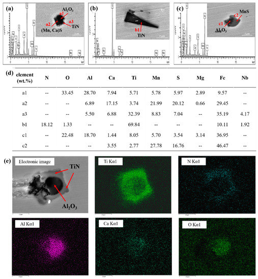 In order to compare the inclusion characteristics, the morphology and EDS spectrum of Beam-1 and Beam-2 steels are obtained respectively. Due to the differences in the chemical composition and structure, inclusions were divided into two types: TiN inclusions and TiN complex inclusions with an oxide core. For the second type of complex inclusion, the core oxide changes simultaneously with the increase of Mg content. Figure 4a–c shows the typical inclusion morphology in Beam-1 steel, and Figure 4d shows the chemical composition of the corresponding inclusions, as marked by red arrow. In Figure 4a, the inclusions are mainly composed of two parts, the darker color area in the center and the lighter color area in the outer shell. According to the EDS results in Figure 4d, it can be seen that the dark part of the center of the complex inclusion is composed of Al, Ca and O, and the gray part of the shell is mainly composed of Ti, Nb, Fe and other elements. Figure 4e shows the detailed characteristics of the typical core-shell inclusion. It can be clearly seen that the core is mainly composed of oxide inclusions containing Al, Ca, O and other elements, and the outer shell is mainly TiN.