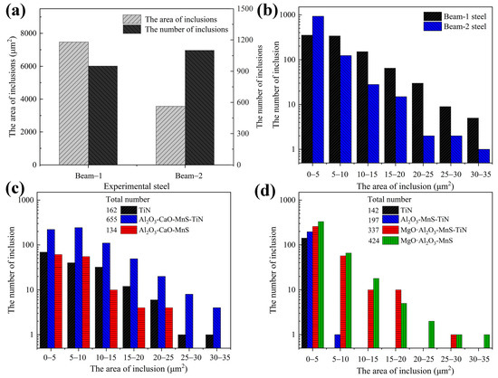 Figure 7 shows inclusion distribution characteristics in the experimental steels. In order to improve the reliability of data statistics, the number of inclusions in the same scanning area of the experimental steels was counted separately. The effective inclusion numbers of the Beam-1 and Beam-2 experimental steels are 951 and 1100, respectively. As shown in Figure 7a, the total number of inclusions in the scanning area of Beam-1 steel is significantly less than that of Beam-2 steel, while the total area of inclusions is twice that of the inclusions in Beam-2 steel. Figure 7b shows the relationship between the area distribution and number of inclusions in experimental steels. The inclusion area in Beam-1 steel is mostly distributed in the range of 0–10 μm2, while the inclusion area in Beam-2 steel is mainly distributed in the range of 0–5 μm2. In addition, the inclusions with an area greater than 5 μm2 in Beam-2 steel are less than those in the Beam-1 steel.