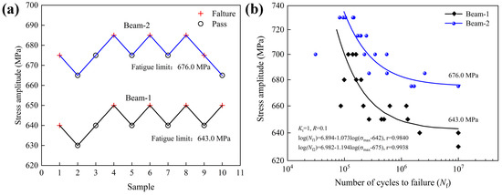 Figure 8a shows the high-cycle fatigue strength of the experimental steels tested by the staircase method. According to GBT 24147-2009, the fatigue limit strength (107 cycles) of Beam-1 and Beam-2 steels are determined. The stress amplitude interval is 10 MPa in this work. If fatigue failure occurs before the sample reaches 107 cycles, the next sample is tested at a lower stress amplitude. The results show that the fatigue strength of Beam-1 steel and Beam-2 steel are 643 MPa and 676 MPa, respectively. Based on the fatigue strength, the least square method is used to fit the HCF test data and the fatigue strength to obtain S-N curves of experimental steels, as shown in Figure 8b. It can be seen that under the same stress amplitude, the fatigue life of Beam-2 steel is significantly higher than that of Beam-1 steel.