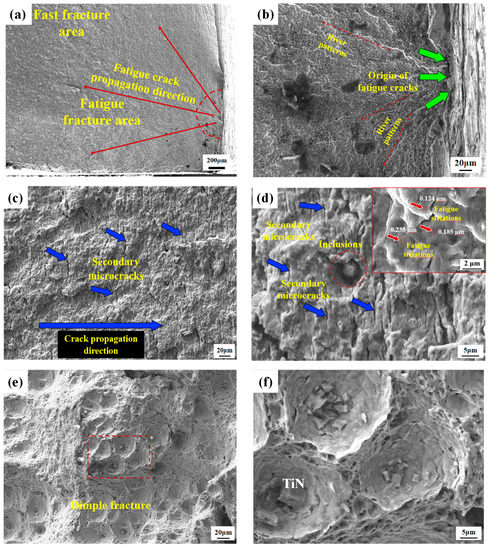 In general, inclusions inevitably exist in steel, and these inclusions have a direct impact on the fatigue life of the material [10,11,12]. During cyclic loading, hard and brittle inclusions can easily to form microscopic cracks in steel, and gradually expand to form macroscopic cracks, resulting in fatigue failure. The physical properties (expansion coefficient, hardness, etc.) and the number, size, shape and other factors of inclusions will cause different degrees of the damage to fatigue performance [13,14,15,16]. Studies have shown that TiN with sharp shape and hard brittleness has 4 times more harmful effect on fatigue performance than spherical oxide inclusions [17,18,19].