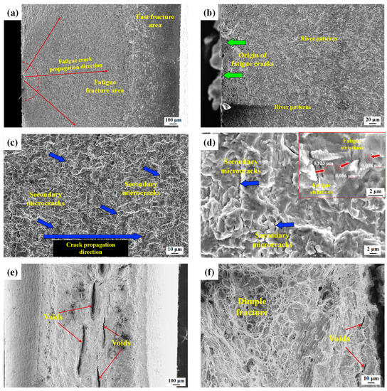Fatigue fracture morphology of Beam-2 Steel, σa = 685 MPa, Nf = 2.7 × 105: (a,b) fatigue crack initiation area, (c,d) fatigue crack stable propagation area, (e,f) fatigue crack instability propagation area.
