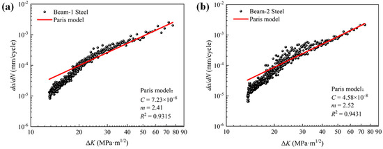 FCG experimental results and Paris model fitting results, (a) Beam-1 steel, (b) Beam-2 steel.