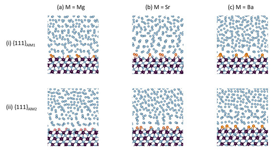 We first report our observation of the AIMD simulation processes. It was observed that the segregated AE atoms remained close to the γ-Al2O3{1 1 1} substrate surfaces and had no trend of moving into the liquid Al. This indicates stability of the AE-segregated interfaces, corresponding to the lower electronegativity of the AE atoms as compared to that of Al. Meanwhile, we also observed occasions in which Mg atoms moved into the oxide substrates (see Supplementary Materials Figure S1). These observations may relate to the formation of spinel from γ-alumina in Mg–Al liquid using liquid handling and casting [12,13]. We will not further discuss this issue in this paper.