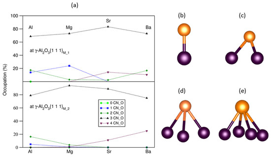 Statistics of the interfacial O–M bonds between a substrate and a liquid or amorphous layer may give insight into the interfacial chemistry [16,30,33,47]. The interfacial bonding between terminating metal atoms and the outmost O atoms at the L-Al/γ- alumina interfaces with and without AE segregations was analyzed. There are four types of M coordination by O (Figure 4b,e). The obtained statistical results are plotted into Figure 4a.